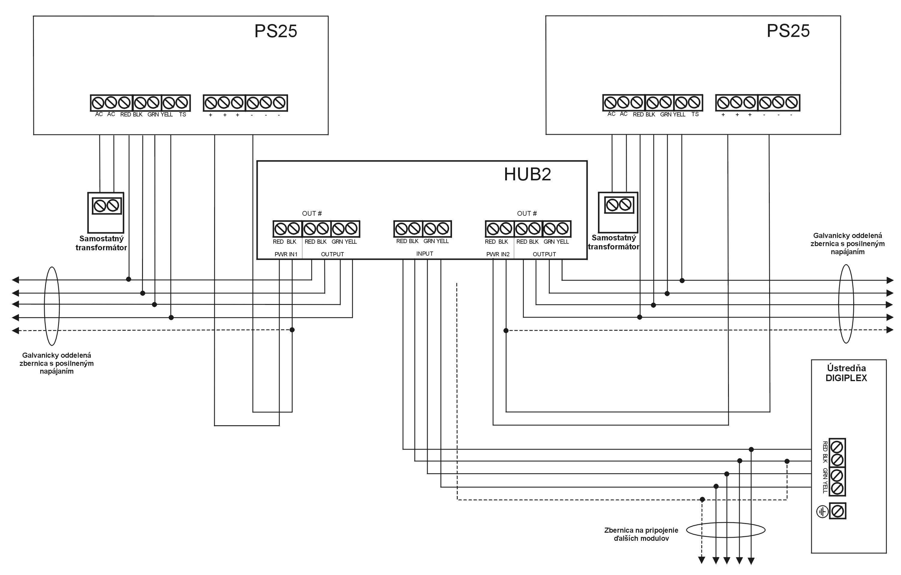 Vždy je dobré mať rezervu. Občas sa stane, že je treba doplniť detektory na miestach, kde pôvodne nemali byť. Alebo sa nedá dodržať pôvodná trasa a obchvat sa nepredvídane predĺži. Prípadne sa ukáže, že signál po niekoľko 100 metroch pri prenose na danom kábli už nemá želanú kvalitu. To sú chvíle, keď sa uplatní modul HUB2. Zbernica ústrední DIGIPLEX môže mať pri použití kábla Alfa-8 DGP dĺžku až 800 metrov... Ale ak by predsa, moduly HUB2 sú k dispozícii.